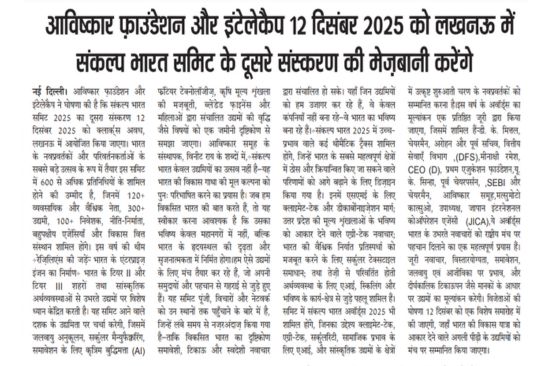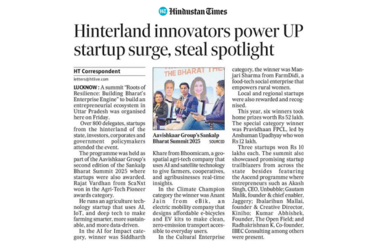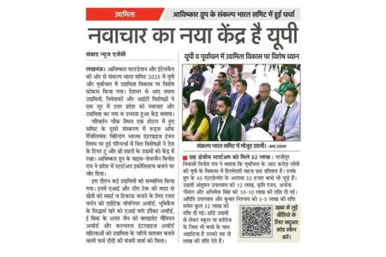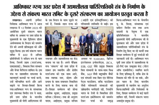 Media Saral Jeevan India Foundation, Frontier Markets and Microsoft Partner to provide AI Skills to 30,000 Rural SHG Women under She Leads Bharat Initiative Hindustan Times Lucknow Aavishkaar Group presents the second edition of the Sankalp Bharat Summit with the objective of building an entrepreneurial ecosystem in Uttar Pradesh. Dec 16, 2025 Awadhnama Lucknow Discussion held in the Sankalp Bharat Committee of the Aavishkaar Group. Dec 13, 2025 Amar Ujala Hinterland innovators power UP startup surge, steal spotlight Dec 13, 2025 Hindustan Times Lucknow Aavishkaar Foundation and Intellicap will host the second edition of the Sankalp Bharat Summit in Lucknow on 12 December 2025. Nov 28, 2025 Janmadhyam lucknow उद्यमिता विकास कार्यक्रम का आयोजन - Interview of Aavishkaar Foundation's Siddhant Raj Sept, 2025 News 20 Uttar Pradesh